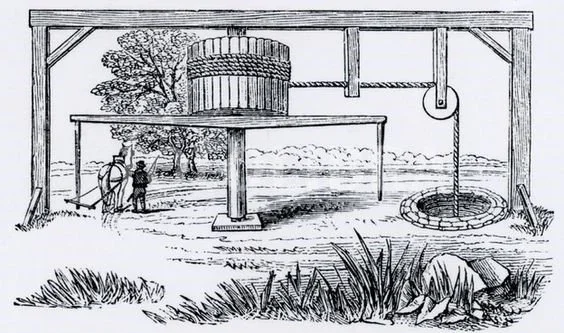 The image actually shows the mechanism lifting from a well, but the set up is was the same to pull the blocks of granite and limestone.
