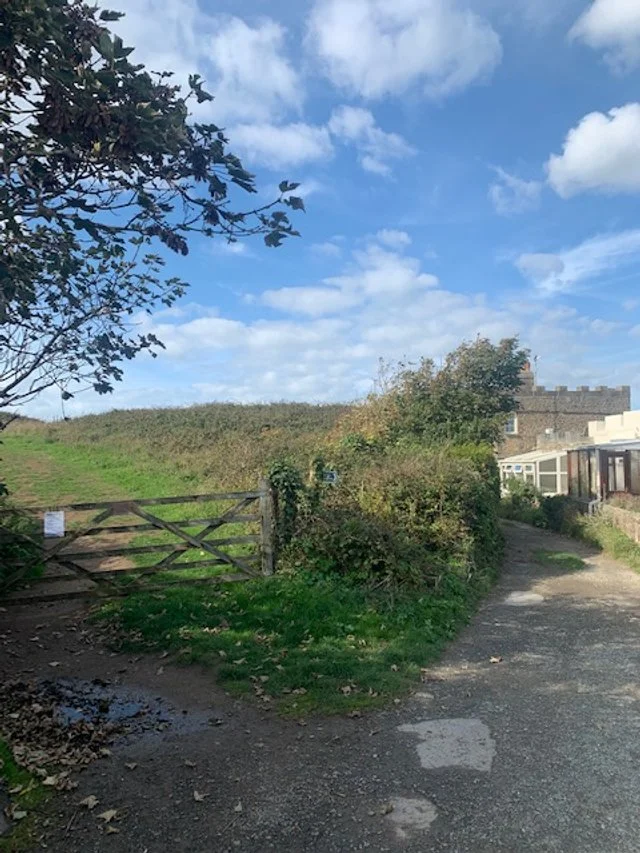 Continue along the path until you arrive at this well-worn path forking off to the left and rising up to Compass Point. Efford House will be seen on your left.